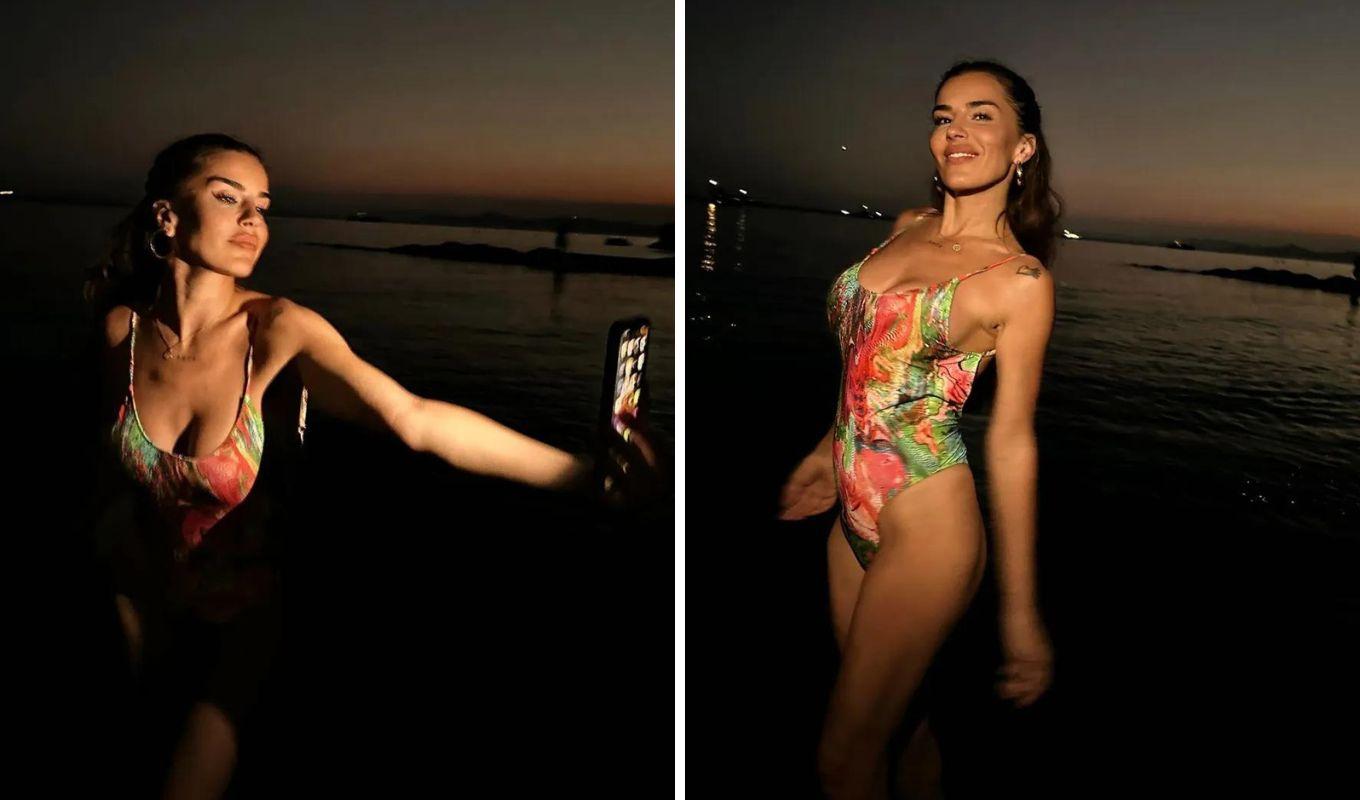 Στις φωτογραφίες που ανάρτησε στον προσωπικό της λογαριασμό στο Instagram, ποζάρει με ένα χρωματιστό ολόσωμο μαγιό, ενώ πίσω της τα φώτα αντανακλούν στη θάλασσα.
