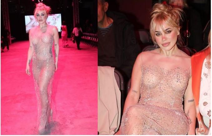 H τραγουδίστρια εμφανίστηκε με maxi φόρεμα διαφάνεια, το οποίο είχε εκατοντάδες στρας. Από μέσα φορούσε εσώρουχα σε nude χρώμα και τα παπούτσια ήταν ψηλοτάκουνα μποτάκια επίσης σε nude χρώμα, ενώ τα μαλλιά της ήταν πιασμένα σε κότσο σε μια εμφάνιση στο κόκκινο χαλί της επίδειξης, που, όπως ήταν φυσικό, τράβηξε όλα τα φωτογραφικά φλας. Μάλιστα, δεν ήταν λίγοι εκείνοι που σχολιάζοντας τη συγκεκριμένη εμφάνιση την παρομοίασαν με αυτές που μας έχει συνηθίσει η Μπιάνκα Σενσόρι, η οποία κυκλοφορούσε σχεδόν γυμνή όταν εμφανιζόταν στο πλευρό του ράπερ Κάνιε Γουέστ.