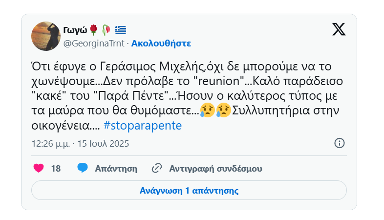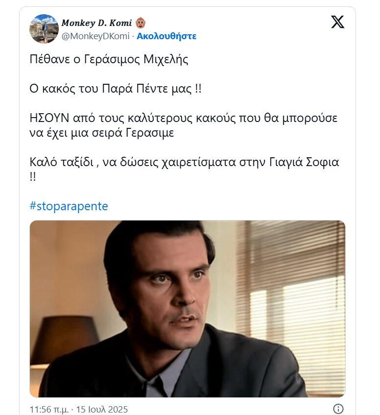 Γεράσιμος Μιχελής: Θρήνος στο Χ – “Ο μοναδικός “δολοφόνος” που αγαπήσαμε”. Ο ξαφνικός θάνατος του Γεράσιμου Μιχελή βύθισε σε θλίψη το κοινό και τους φαν της εμβληματικής σειράς «Στο Παρά Πέντε», στην οποία είχε ενσαρκώσει με ξεχωριστό τρόπο τον «κακό» της υπόθεσης. Αν και ο ρόλος του ήταν σκοτεινός, ο ίδιος αγαπήθηκε ιδιαίτερα από το τηλεοπτικό κοινό για την υποκριτική του δεινότητα και τη μοναδική του παρουσία στη μικρή οθόνη.