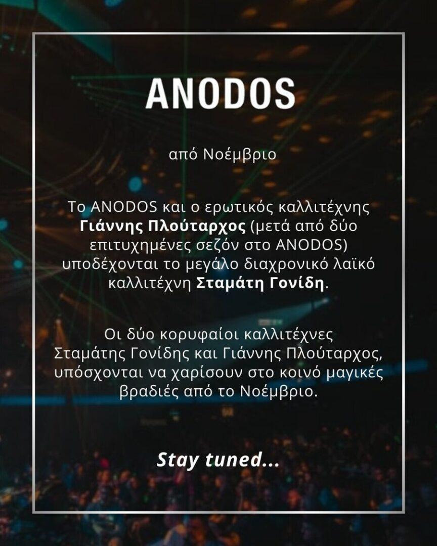 Ο Σταμάτης Γονίδης προκάλεσε έκπληξη με την απόφασή του να αποχωρήσει από το πολυαναμενόμενο σχήμα με τον Γιάννη Πλούταρχο στο ANODOS Live Stage, λίγες μέρες πριν από την προγραμματισμένη έναρξη των εμφανίσεών τους. Η συνεργασία είχε ανακοινωθεί με κάθε επισημότητα και στόχο είχε να προσφέρει στο κοινό αξέχαστες βραδιές από τον Νοέμβριο, όμως η ανακοίνωση του Σταμάτη Γονίδη «έσκασε» σαν κεραυνός.