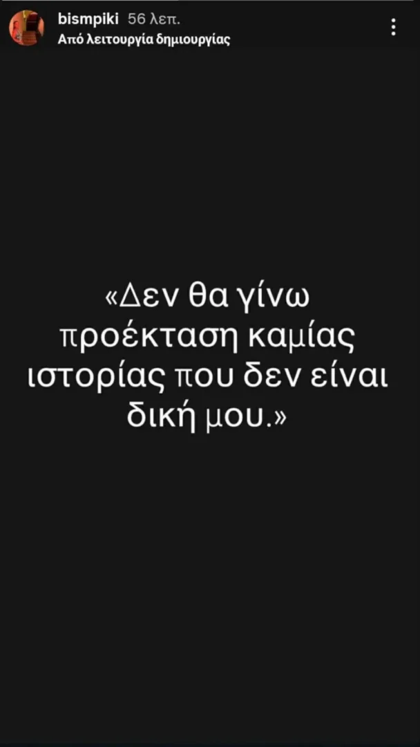 Αν η οικογένεια του Βασίλη Μπισμπίκη, βέβαια, είναι στο πλευρό του, αυτό το γνωρίζουν μόνο ο ίδιος και το περιβάλλον του. Το βέβαιο είναι πως, με ανάρτησή της, η αδελφή του, η οποία δεν έχει αναμειχθεί στην υπόθεση καθ’ οιονδήποτε τρόπο, πήρε αποστάσεις τόσο του συμβάντος όσο και του ηθοποιού. Συγκεκριμένα, ανήρτησε φωτογραφία σε μαύρο φόντο, με τίτλο «Δεν θα γίνω προέκταση καμιάς ιστορίας που δεν είναι δική μου». Δεν αποκλείεται, λοιπόν, η γυναίκα να ήθελε, έπειτα από πιθανές οχλήσεις να μιλήσει για το συμβάν, να ξεκαθαρίσει τη θέση της και να κρατήσει τα εν οίκω… εν οίκω. Όπως και να έχει, πάντως, ο γνωστός ηθοποιός δεν προσβλέπει σε πολλές φωνές συμπαράστασης, τουλάχιστον δημοσίως.
