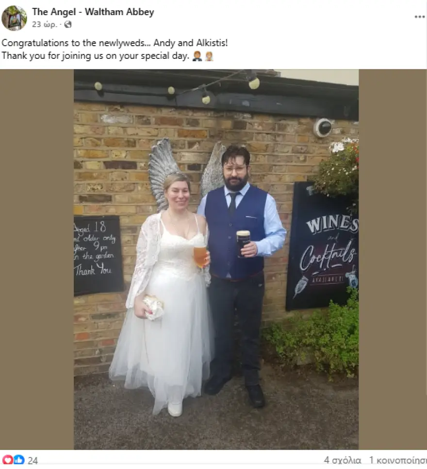 Το ζευγάρι επέλεξε να κάνει γαμήλιο πάρτι σε παμπ στο Λονδίνο. Σε ανάρτηση που έκανε ο επίσημος λογαριασμός του μαγαζιού, φαίνεται η Άλκηστις Αλεξανδράτου με το νυφικό της, ποζάροντας χαμογελαστή στο πλευρό του συζύγου της.