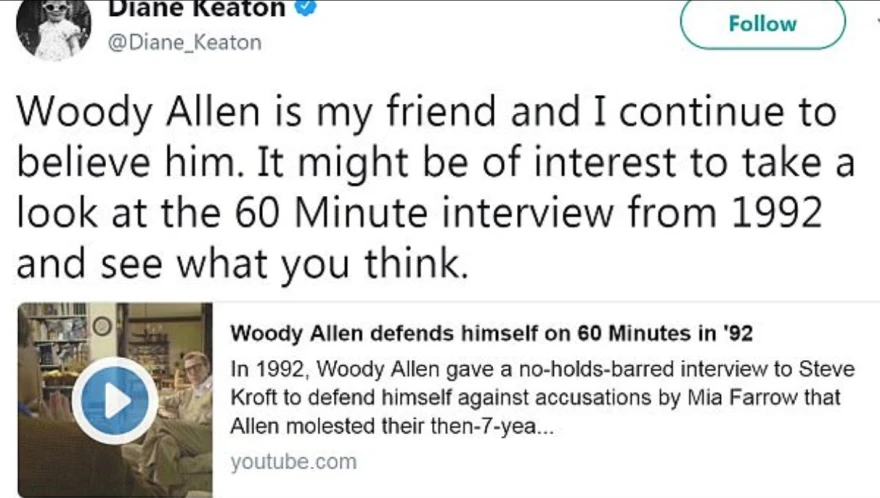 Παρά τις αντιπαραθέσεις που σκίασαν την καριέρα του Άλεν, η Κίτον δεν έπαψε ποτέ να τον στηρίζει. Το 2018, εν μέσω του κινήματος #MeToo και των κατηγοριών εναντίον του για σεξουαλική κακοποίηση της θετής του κόρης Ντίλαν Φάροου, η Κίτον τον υπερασπίστηκε δημόσια. «Ο Γούντι Άλεν είναι φίλος μου και συνεχίζω να τον πιστεύω», είχε γράψει στο Twitter.