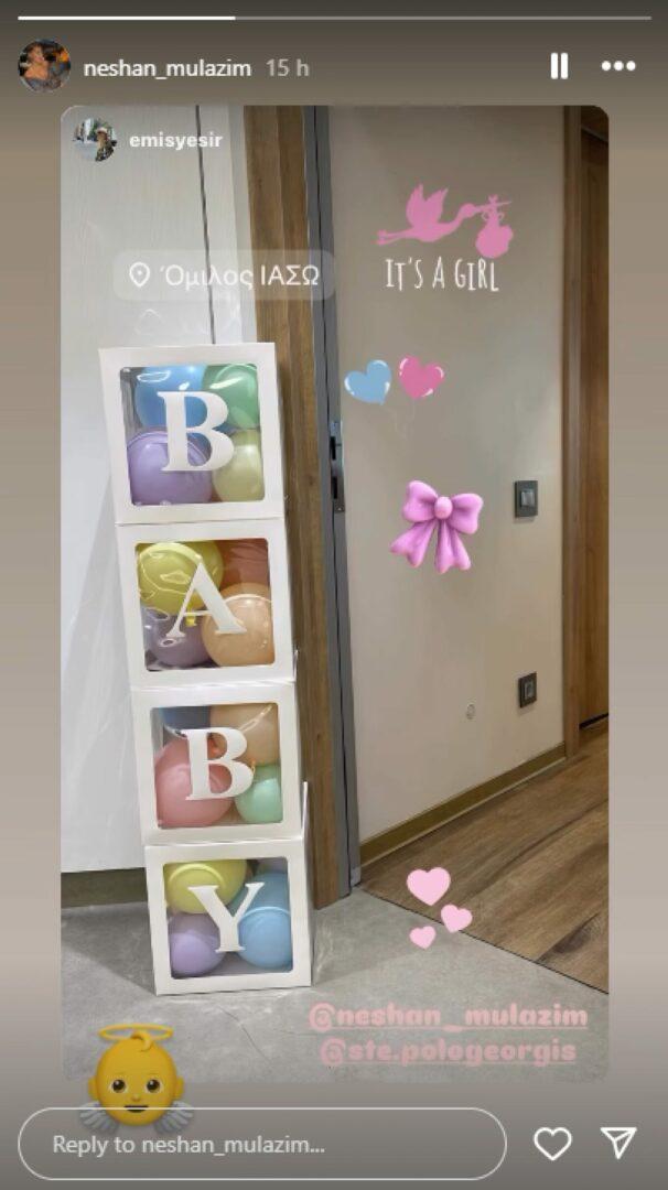 Συγκεκριμένα, η Νεσχάν Μουλαζίμ αναδημοσίευσε στο Instagram μια ανάρτηση που έκανε φίλη της, η οποία την επισκέφτηκε στο μαιευτήριο. Σε αυτή, φαίνεται μια κατασκευή με μπαλόνια που τοποθετήθηκε έξω το δωμάτιο. «Είναι κορίτσι» (It’s a girl), αναγράφεται πάνω σε αυτή.