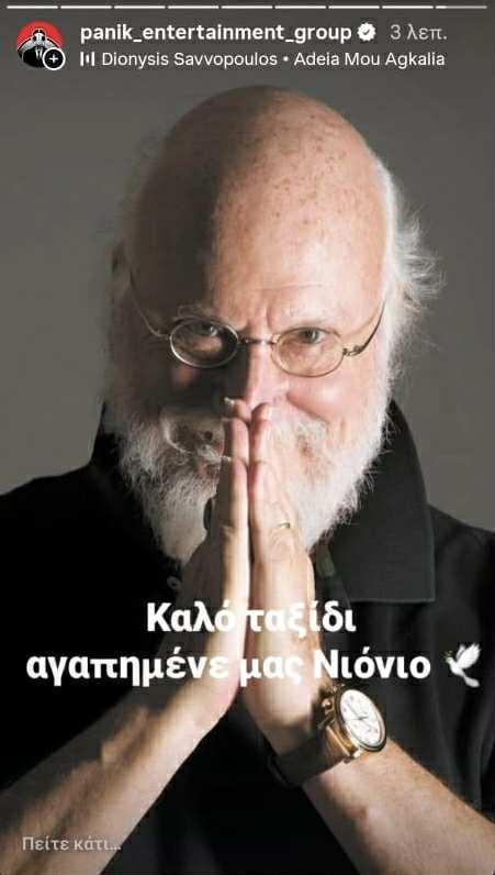 Το βράδυ της Τρίτης 21 Οκτωβρίου, ο Διονύσης Σαββόπουλος έφυγε από τη ζωή σε ηλικία 81 ετών. Ο σπουδαίος τραγουδοποιός τις τελευταίες μέρες νοσηλευόταν στο Υγεία, στο Καρδιολογικό τμήμα. Όπως είχε γίνει γνωστό, ο Διονύσης Σαββόπουλος έδινε μάχη με τον καρκίνο από το 2021. Ήταν παντρεμένος με την Ασπασία Σαββοπούλου με την οποία είχαν αποκτήσει μαζί δύο γιους και δύο εγγόνια. Λίγες ώρες μετά την είδηση του θανάτου του, η οικογένεια με ανακοίνωση στα social media αποχαιρέτησε τον Διονύση Σαββόπουλο.