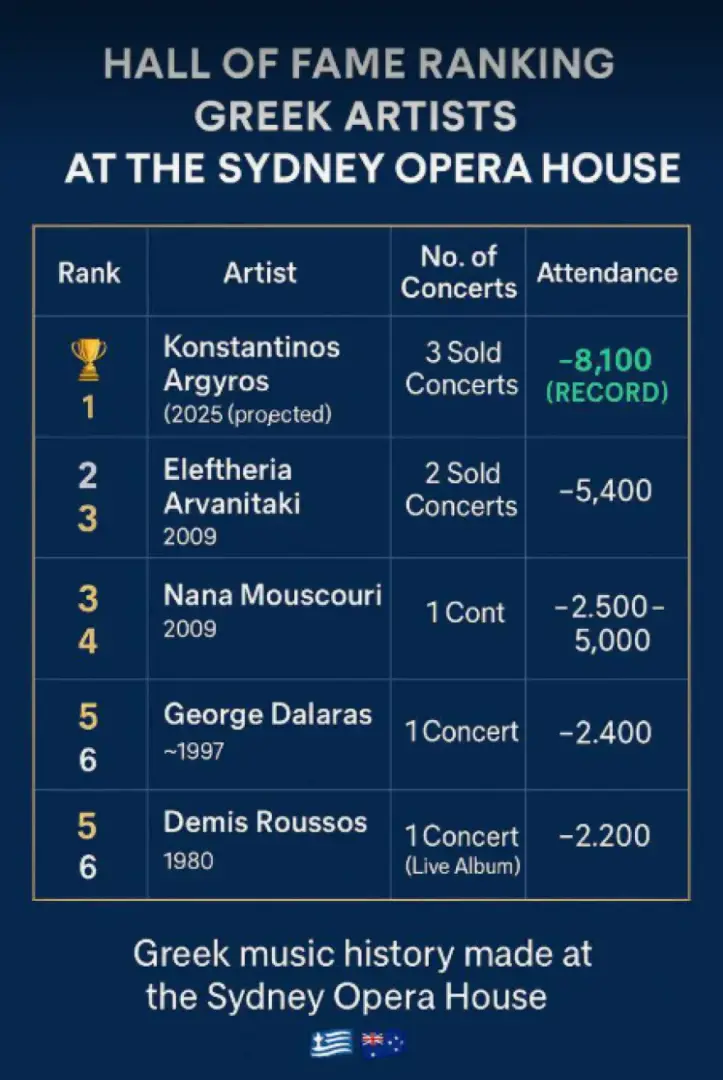 Η Όπερα του Σίδνεϊ αποτελεί έναν από τους πιο εμβληματικούς συναυλιακούς χώρους στον κόσμο και κάθε εμφάνιση εκεί καταγράφεται ως σημαντική στιγμή για κάθε καλλιτέχνη. Σύμφωνα με την πρόσφατη «Hall of Fame Ranking» λίστα που αποτυπώνει την προσέλευση Ελλήνων καλλιτεχνών στον συγκεκριμένο χώρο, ο Κωνσταντίνος Αργυρός αναμένεται να βρεθεί στις 27, 29 και 30 Οκτωβρίου, σημειώνοντας ρεκόρ προσέλευσης με τρεις συναυλίες και περίπου 8.100 θεατές συνολικά.