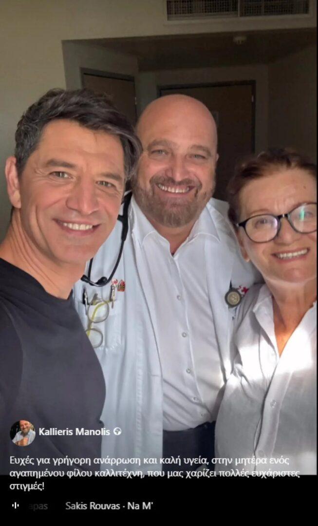 Το πρωινό της Πέμπτης, μετά από σειρά εξετάσεων που πήγαν εξαιρετικά καλά, ο προσωπικός της γιατρός, Μανώλης Καλλιέρης, Επίκουρος Καθηγητής Καρδιολογίας στο Πανεπιστήμιο Λευκωσίας και διευθυντής μονάδας εμφραγμάτων σε ιδιωτική κλινική, δημοσίευσε μια φωτογραφία στα social media. Σε αυτήν ποζάρει χαμογελαστός μαζί με τη Μαρία Παναρέτου — που μόλις είχε πάρει εξιτήριο — και τον Σάκη Ρουβά, ο οποίος δεν έκρυβε τη συγκίνησή του.