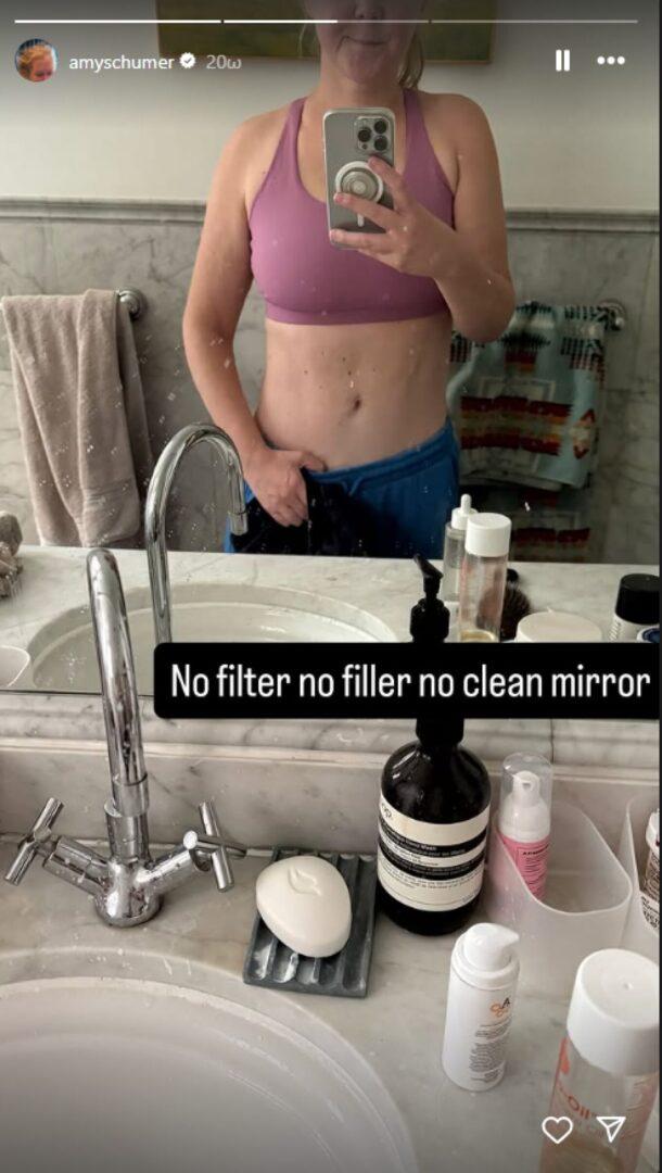 Η κωμική ηθοποιός ανέβασε στον προσωπικό της λογαριασμό στο Instagram μια selfie που τράβηξε στον καθρέφτη του μπάνιου της και τη δείχνει να ποζάρει φορώντας ένα αθλητικό μπουστάκι και φόρμα. Πάνω στην ανάρτησή της, τόνισε πως δεν έχει χρησιμοποιήσει ούτε φίλτρα, αλλά ούτε και fillers στο εν λόγω στιγμιότυπο.