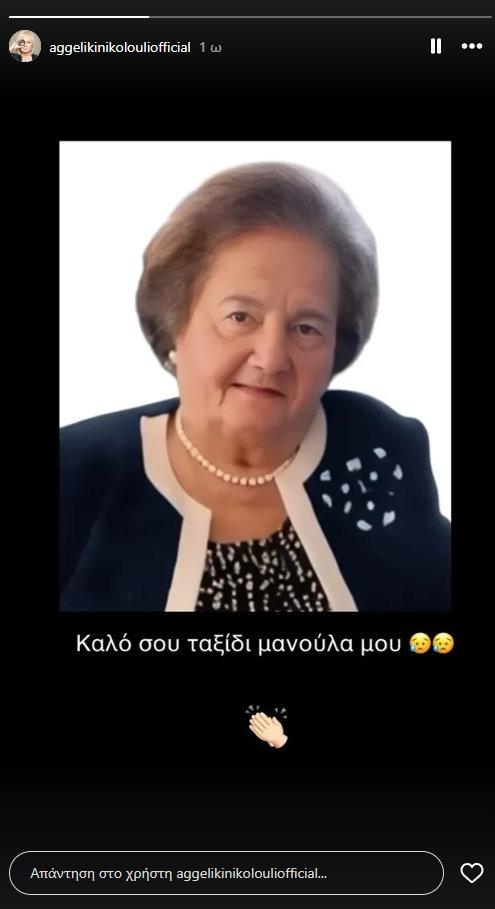 Το μεσημέρι της Δευτέρας 3 Νοεμβρίου, η Αγγελική μοιράστηκε μια νέα φωτογραφία με τη μητέρα της, συνοδεύοντάς την με την λιτή αλλά συγκινητική φράση: «Καλό σου ταξίδι, μανούλα μου». Η σχέση τους ήταν ιδιαίτερα δεμένη, με αγάπη και φροντίδα που ξεχείλιζαν από κάθε κοινή στιγμή.