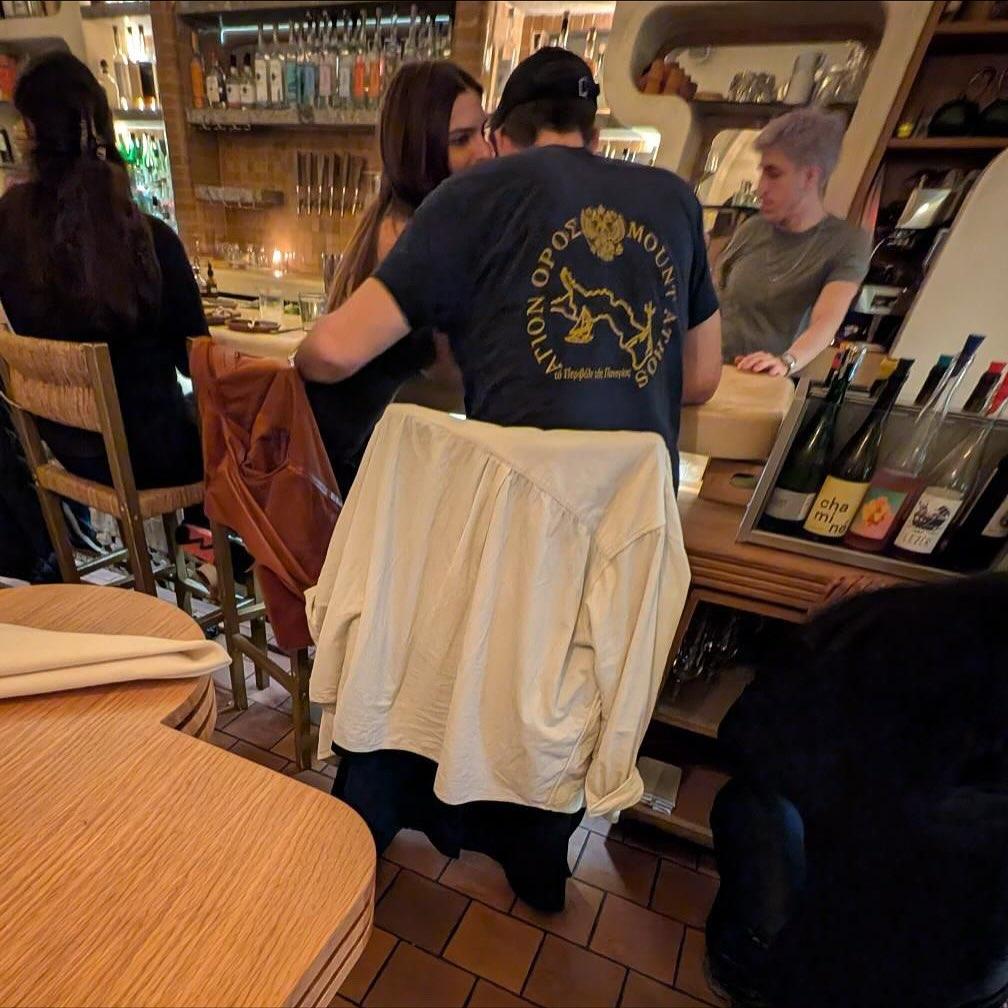 Αυτό που έκανε επίσης μεγάλη εντύπωση ήταν όταν ο Ρομέν Γαβράς έβγαλε το πανωφόρι του μέσα στο εστιατόριο, αποκαλύπτοντας το μπλε μλουζάκι που φορούσε, το οποίο πρόδιδε την ελληνική του καταγωγή. Συγκεκριμένα η μπλούζα έγραφε «Άγιον Όρος, το περιβόλι της Παναγίας» και «Mount Athos» στα αγγλικά, όπως φαίνεται στη φωτογραφία του Deux Moi.