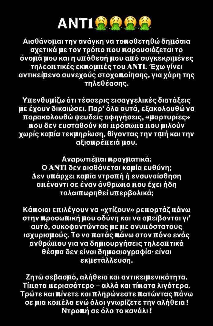 Ο δημοσιογράφος δεν άφησε αναπάντητες τις αιχμές. Με δημοσίευση στο X, έδωσε μια ευθεία απάντηση, υπερασπιζόμενος το ρεπορτάζ και τον τρόπο λειτουργίας της εκπομπής του. «Θα το πω καθαρά και χωρίς περιστροφές: Η δημοσιογραφία δεν εκβιάζεται και δεν εκφοβίζεται», έγραψε, υπογραμμίζοντας ότι «η εκπομπή λειτουργεί με τεκμήρια, πραγματογνωμοσύνες και επίσημα έγγραφα, με μαρτυρίες και όχι με συναισθηματικές πιέσεις».