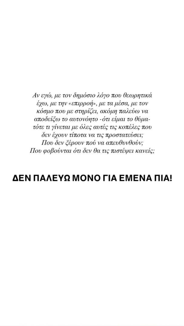 Αν εγώ, με τον δημόσιο λόγο που θεωρητικά έχω, με την «επιρροή», με τα μέσα, με τον κόσμο που με στηρίζει, ακόμη παλεύω να αποδείξω το αυτονόητο –ότι είμαι το θύμα– τότε τι γίνεται με όλες αυτές τις κοπέλες που δεν έχουν τίποτα να τις προστατεύσει; Που δεν ξέρουν πού να απευθυνθούν; Που φοβούνται ότι δεν θα τις πιστέψει κανείς; ΔΕΝ ΠΑΛΕΥΩ ΜΟΝΟ ΓΙΑ ΕΜΕΝΑ ΠΙΑ!