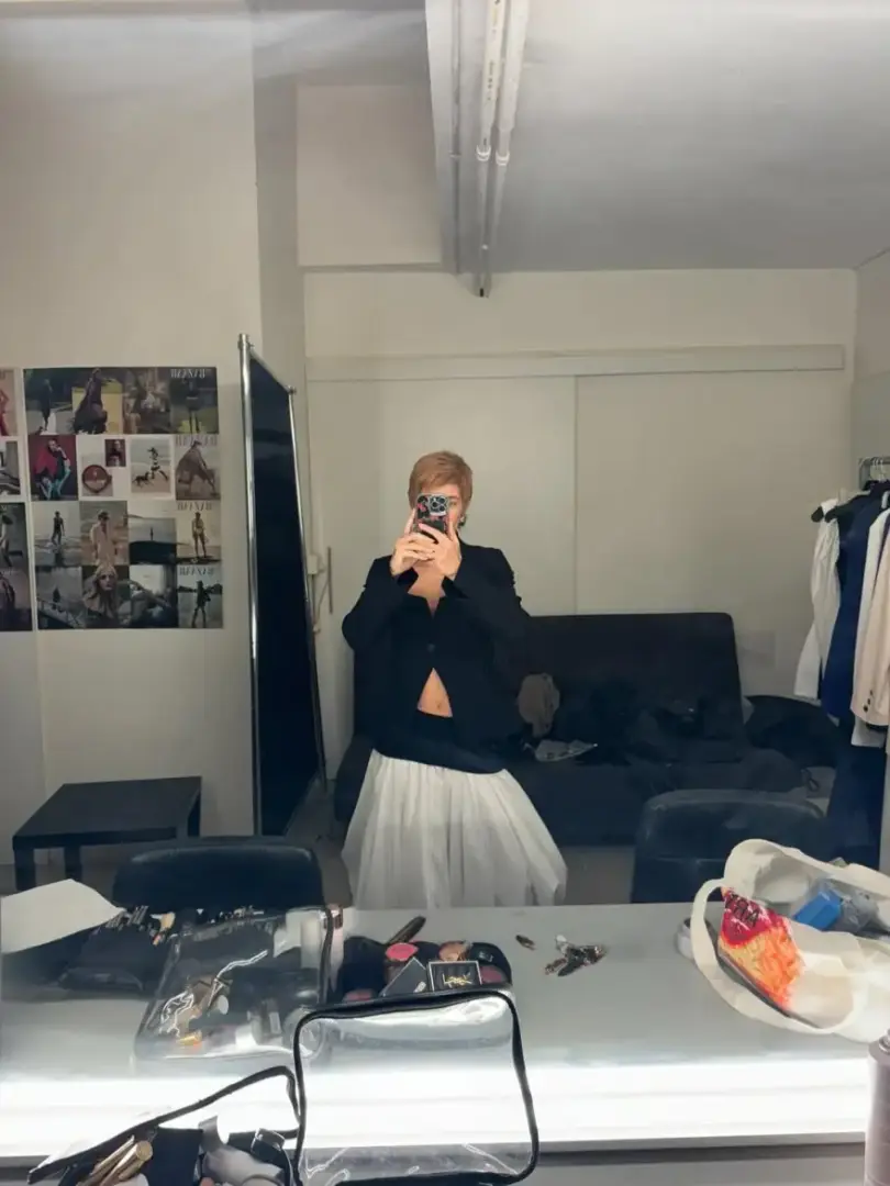 H Κλέλια Ανδριολάτου παρουσίασε μερικές στιγμές από την προετοιμασία της, ποζάροντας σε καθρέφτη με αγορέ look και την περούκα σε ανοιχτή απόχρωση, που φόρεσε.