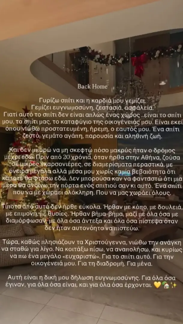 Με αφορμή τις ημέρες των Χριστουγέννων που πλησιάζουν, η ηθοποιός ένιωσε την ανάγκη να κάνει μια παύση και να κοιτάξει πίσω στη διαδρομή της. Να αναλογιστεί όλα όσα πέρασε, όλα όσα πέτυχε και, πάνω απ’ όλα, να εκφράσει ένα μεγάλο «ευχαριστώ» — για το σπίτι της, για την οικογένειά της, για τη ζωή που έχει χτίσει με κόπο και αγάπη.