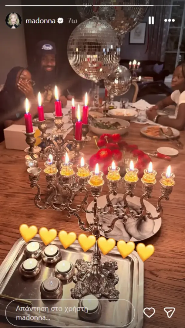 Σε άλλη εικόνα που κοινοποίησε, η Μαντόνα έδειξε ότι γιόρτασε την έβδομη ημέρα της εβραϊκής γιορτής Χάνουκα μαζί με τον Ακίμ Μόρις και μερικά από τα παιδιά της. Ο Τζαμαϊκανός ποδοσφαιριστής φαίνεται καθισμένος σε ένα μακρύ τραπέζι, χαμογελαστός, καθώς η οικογένεια απολάμβανε το γεύμα της.