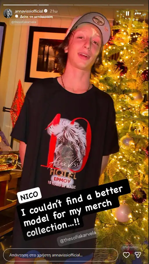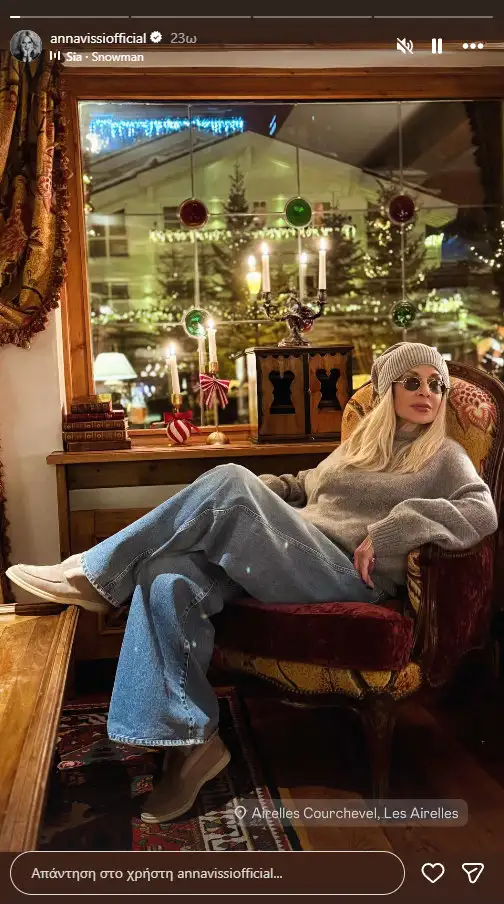 Σε μία από τις αναρτήσεις, η ίδια ποζάρει χαλαρή καθισμένη σε πολυθρόνα, απολαμβάνοντας την ατμόσφαιρα του χειμερινού θέρετρου. Σε άλλη φωτογραφία, πρωταγωνιστεί ο εγγονός της, ο οποίος φορά ένα T-shirt αφιερωμένο στα 10 χρόνια των επιτυχημένων εμφανίσεών της σε γνωστό νυχτερινό κέντρο. Η Άννα Βίσση, με το γνώριμο χιούμορ της, σχολίασε πως δεν θα μπορούσε να βρει καλύτερο «μοντέλο» για τη συγκεκριμένη εμφάνιση.
