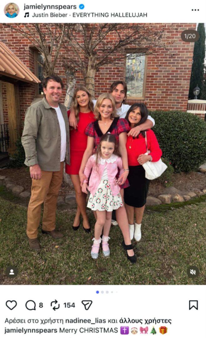 Τη Δευτέρα, η Σπίαρς ανάρτησε στον προσωπικό της λογαριασμό στο Instagram μία εικόνα με το χριστουγεννιάτικο δέντρο του σπιτιού της και σημείωσε απευθυνόμενη με αιχμηρό τρόπο σε μέλη της οικογένειάς της: «Καθυστερημένα, χρόνια πολλά για τα Χριστούγεννα στην όμορφη οικογένειά μου, που ποτέ δεν ήταν ασεβής απέναντί μου, δεν με πλήγωσε, δεν προχώρησε σε κάτι εντελώς απαράδεκτο ούτε μου προκάλεσε ανείπωτο τραύμα, από εκείνα που δεν επανορθώνονται. Στη γλυκιά, αγαπημένη και αθώα οικογένειά μου ζητώ ειλικρινά συγγνώμη που ήμουν απασχολημένη αυτά τα Χριστούγεννα, όμως σίγουρα θα έρθω και θα σας εκπλήξω πολύ σύντομα. Ανυπομονώ. Γεια σου, όμορφη Άιβι. Θέλω μόνο να σε κρατήσω στην αγκαλιά μου, αγάπη μου».