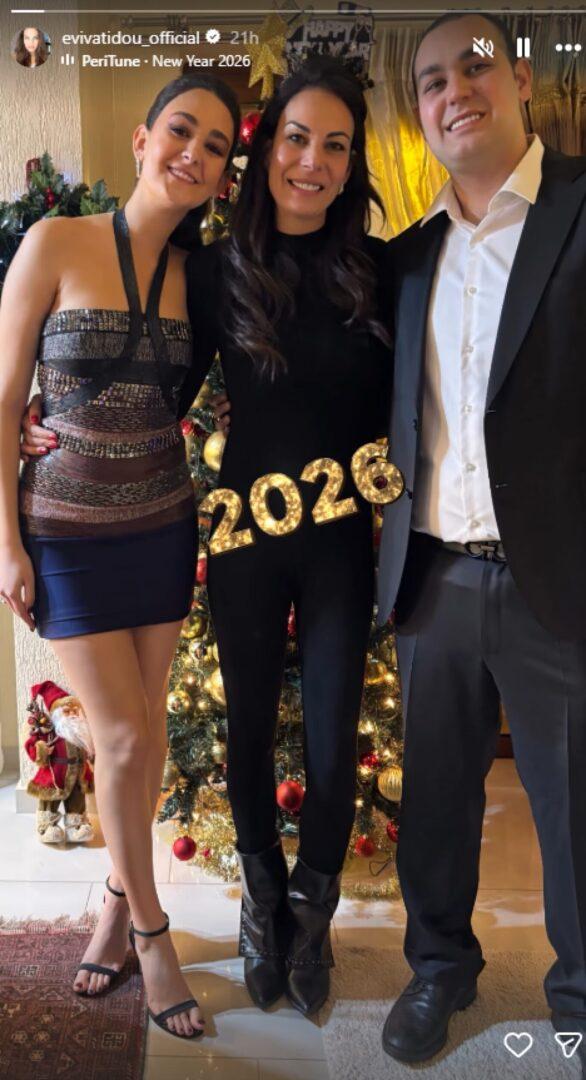 Το μοντέλο πόζαρε αγκαλιά με τον γιο της, Χρίστο Κούγια και την κόρη της, Μάιρα, μπροστά από το χριστουγεννιάτικο δέντρο. Στην εικόνα, η οικογένεια εμφανίζεται χαμογελαστή, δείχνοντας πως πέρασαν μαζί τις πρώτες ώρες του 2026. Την Πέμπτη 1η Ιανουαρίου η Εύη Βατίδου μοιράστηκε με τους διαδικτυακούς της φίλους το στιγμιότυπο μέσω Instagram stories.