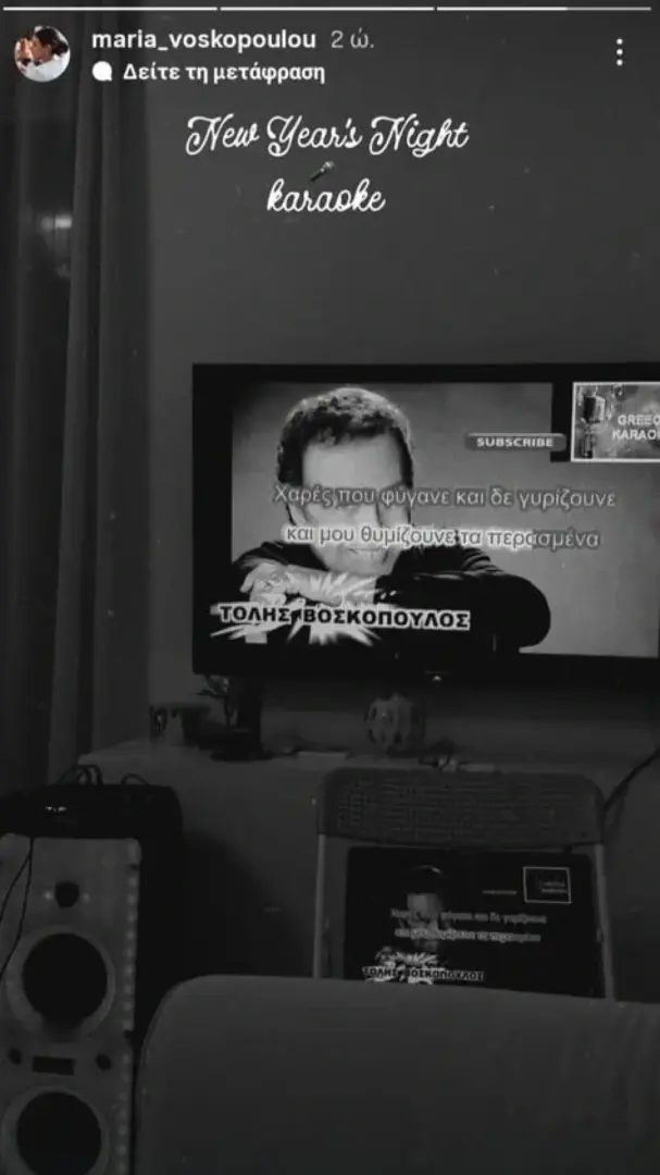 Η κόρη του αείμνηστου τραγουδιστή, που έφυγε από τη ζωή τον Ιούλιο του 2021, έδειξε στους διαδικτυακούς της φίλους πώς υποδέχτηκε τη νέα χρονιά μέσα από ένα story, που έκανε στον προσωπικό της λογαριασμό στο Instagram. Πιο αναλυτικά, η Μαρία Βοσκοπούλου ανάρτησε ένα στιγμιότυπο, στο οποίο φαίνεται πως συμμετείχε σε βραδιά καραόκε, καθώς στην τηλεόραση του σπιτιού όπου βρέθηκε, έπαιζε το κομμάτι του Τόλη Βοσκόπουλου «Οι αναμνήσεις».