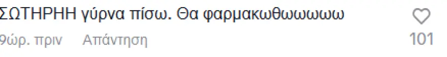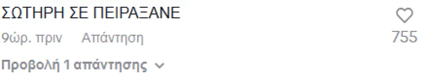 Κάτω από την ανάρτηση αρκετοί εμφανίστηκαν ενθουσιασμένοι με τη συνάντηση των δύο ηθοποιών με πολλούς να εκφράζουν τη χαρά τους μέσα από σχόλια που έκαναν. «Σας αγαπάμε τόσο πολύ και τους δύο, σας χαίρομαι, έτσι αγαπημένους να σας βλέπουμε» σημείωσε κάποιος και κάποιος άλλος πρόσθεσε: «Τελικά είσαι το ταίρι της». Από την ανάρτηση του ηθοποιού δεν έλειψαν και σχόλια με ατάκες της «Στέλλας», όπως «Σωτήρη σε πείραξε» και «Σωτήρη γύρνα πίσω θα φαρμακωθώ».