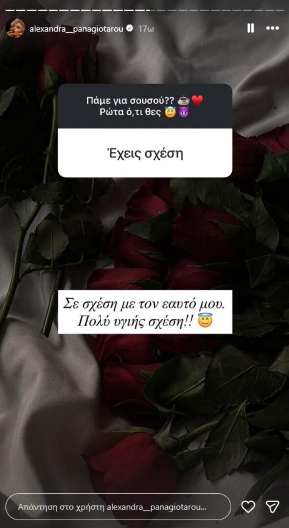 Σε σχέση με τον εαυτό της δήλωσε ότι είναι η Αλεξάνδρα Παναγιώταρου. Η πρώην παίκτρια του «My Style Rocks» προχώρησε την Πέμπτη 15 Ιανουαρίου σε ένα Q&A στον προσωπικό της λογαριασμό στο Instagram, και μεταξύ άλλων ένας ακόλουθός της τη ρώτησε για την προσωπική της ζωή και πιο συγκεκριμένα για το εάν «έχει σχέση» με την Αλεξάνδρα Παναγιώταρου να απαντάει: «Έχω σχέση με τον εαυτό μου, πολύ υγιής σχέση».