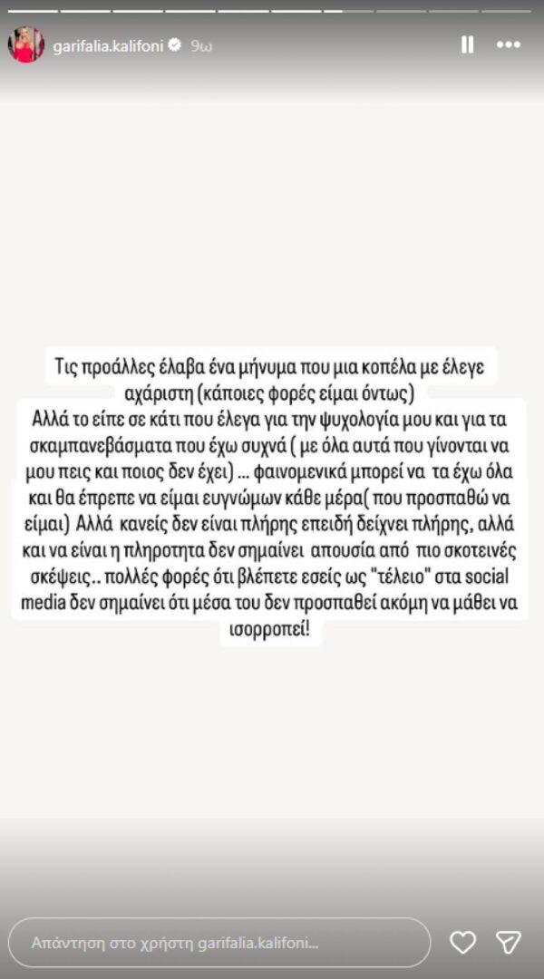 Συγκεκριμένα, η Γαρυφαλλιά Καληφώνη έγραψε στο Instagram story που έκανε: «Τις προάλλες έλαβα ένα μήνυμα που μια κοπέλα με έλεγε αχάριστη (κάποιες φορές είμαι όντως). Αλλά το είπε σε κάτι που έλεγα για την ψυχολογία μου και για τα σκαμπανεβάσματα που έχω συχνά (με όλα αυτά που γίνονται να μου πεις και ποιος δεν έχει). Φαινομενικά μπορεί να τα έχω όλα και θα έπρεπε να είμαι ευγνώμων κάθε μέρα (που προσπαθώ να είμαι). Αλλά κανείς δεν είναι πλήρης επειδή δείχνει πλήρης, αλλά και να είναι πληρότητα δεν σημαίνει απουσία από πιο σκοτεινές σκέψεις. Πολλές φορές ό,τι βλέπετε εσείς ως “τέλειο” στα social media, δεν σημαίνει ότι μέσα του δεν προσπαθεί ακόμα να μάθει να ισορροπεί».