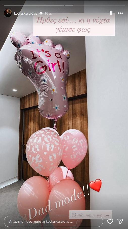 Την ευχάριστη είδηση μοιράστηκε ο ίδιος ο Κώστας Καραφώτης το πρωί της Τετάρτης 28 Ιανουαρίου, μέσα από τα social media. Η φωτογραφία με τα ροζ μπαλόνια στο μαιευτήριο μιλούσε από μόνη της, ενώ ο τραγουδιστής συνόδευσε την ανάρτησή του με λόγια γεμάτα συναίσθημα, επιλέγοντας στίχους από τραγούδι του: «Ήρθες εσύ… κι η νύχτα γέμισε φως». Μια φράση που αποτύπωσε ιδανικά τη νέα πραγματικότητα της ζωής του.