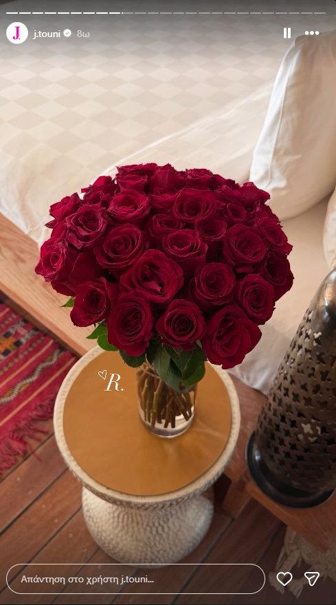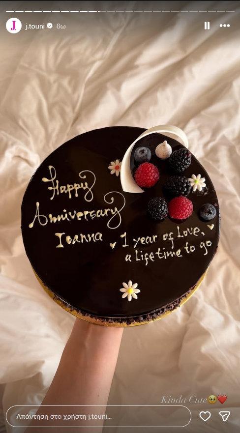 Η γνωστή influencer μοιράστηκε με τους διαδικτυακούς της φίλους μέσα από τον λογαριασμό της στο Instagram τα δώρα που έλαβε από τον αγαπημένο της: κατακόκκινα τριαντάφυλλα, μια εντυπωσιακή τούρτα με ευχές για την επέτειό τους και στιγμιότυπα από την ξεχωριστή αυτή ημέρα. Σε κάθε ανάρτηση για τον σύντροφό της, η Ιωάννα Τούνη προσθέτει το γράμμα R, καθώς οι στενοί φίλοι του Δημήτρη Σπυριδωνίδη τον αποκαλούν Roberto, από το όνομα του σκύλου του.