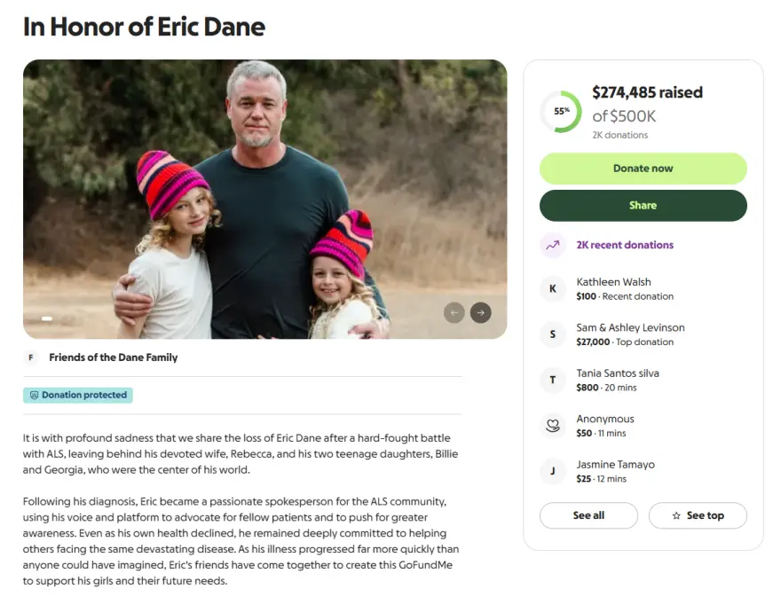 Όπως φαίνεται στην εικόνα, ανάμεσα στα πρόσωπα που έκαναν δωρεά είναι ο δημιουργός του «Euphoria» όπου έπαιξε ο ηθοποιός πριν πεθάνει, Σαμ Λέβινσον, μαζί με τη σύζυγό του, Άσλεϊ. Οι δυο τους έδωσαν 27.000 δολάρια για τα παιδιά του Έρικ Ντέιν. Ο Σαμ Λέβινσον μίλησε στο Variety για τον θάνατο του Ντέιν και δήλωσε: «Είμαι συντετριμμένος από την απώλεια του αγαπημένου μας φίλου Έρικ. Το να δουλέψω μαζί του ήταν τιμή. Το να είμαι φίλος του ήταν δώρο. Η οικογένεια του Έρικ είναι στις προσευχές μας. Είθε η μνήμη του να είναι ευλογία».