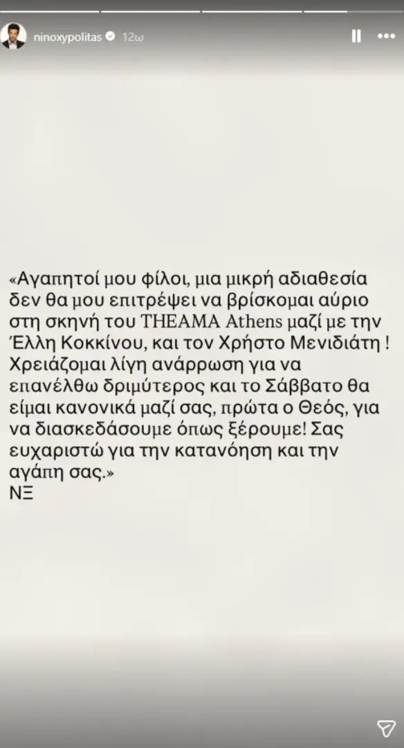 Ο Νίνο επικαλείται λόγους υγείας, εξηγώντας ότι χρειάζεται λίγο χρόνο για ανάρρωση ώστε να επιστρέψει δριμύτερος στο μαγαζί το Σάββατο. Όπως έγραψε: «Αγαπητοί φίλοι, μια μικρή αδιαθεσία δεν θα μου επιτρέψει να βρίσκομαι αύριο στη σκηνή του THEAMA Athens μαζί με την Έλλη Κοκκίνου και τον Χρήστο Μενιδιάτη. Χρειάζομαι λίγη ανάρρωση για να επανέλθω δριμύτερος και το Σάββατο να είμαι κανονικά μαζί σας, πρώτα ο Θεός, για να διασκεδάσουμε όπως ξέρουμε! Σας ευχαριστώ για την κατανόηση και την αγάπη σας».