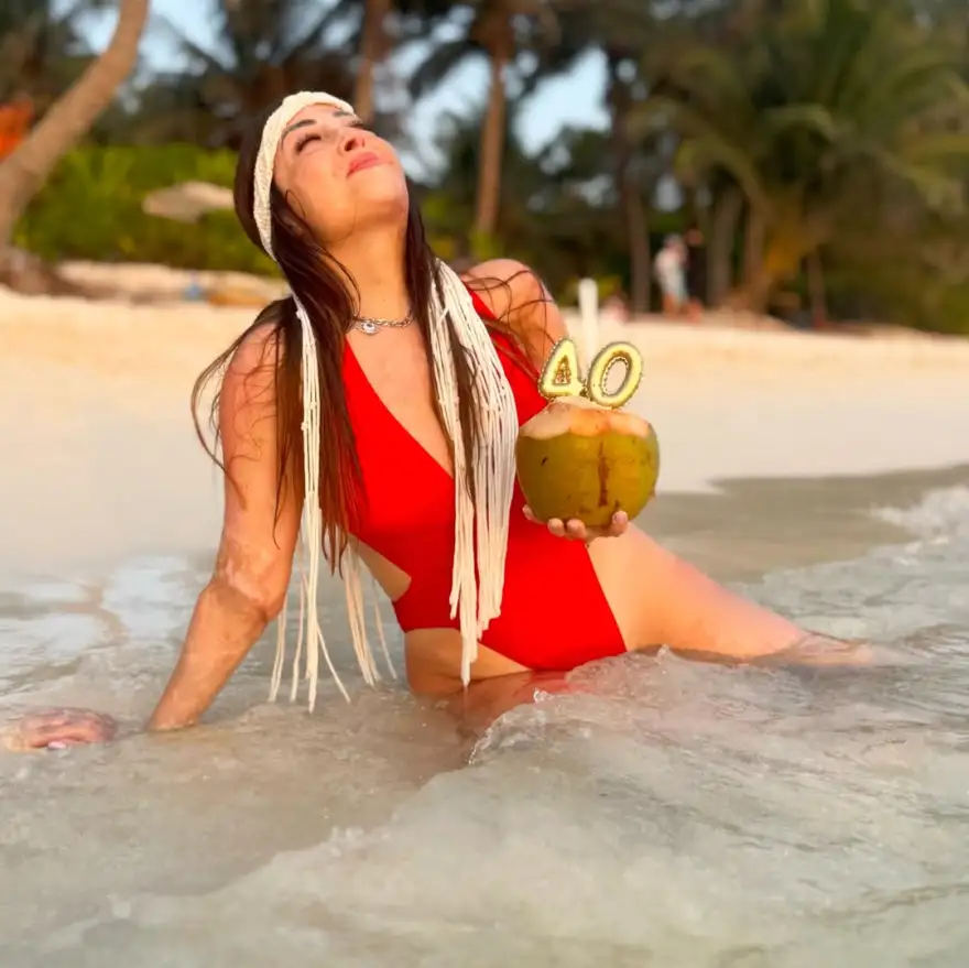 Στις εικόνες που ανάρτησε στα social media, η Ιωάννα Παλιοσπύρου εμφανίζεται χαμογελαστή στην παραλία, φορώντας ένα κόκκινο μαγιό και κρατώντας στα χέρια της μια καρύδα με κεράκια. Το σκηνικό ήταν απόλυτα καλοκαιρινό και γιορτινό, με το γαλάζιο της θάλασσας και την τροπική ατμόσφαιρα να δημιουργούν ένα ονειρικό φόντο για τη στιγμή.