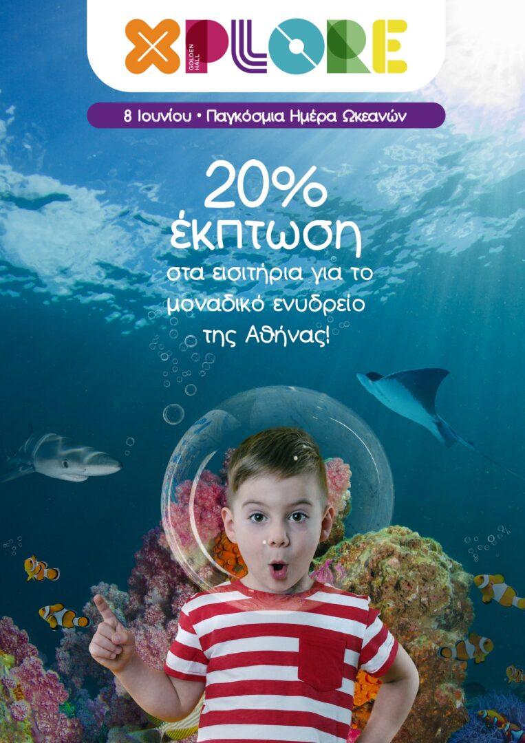 Το XPLORE Oceans, το μοναδικό ενυδρείο της Αθήνας, που για εκείνη την ημέρα έχει την τιμητική του, σας περιμένει να ανακαλύψετε τα μυστικά των ωκεανών και να δείτε από κοντά τα υπέροχα θαλάσσια πλάσματα του, προσφέροντας έκπτωση -20% στην αγορά εισιτηρίων. Η έκπτωση ισχύει στα ταμεία του XPLORE και στις online αγορές εισιτήριων με τη χρήση του κωδικού oceansday.