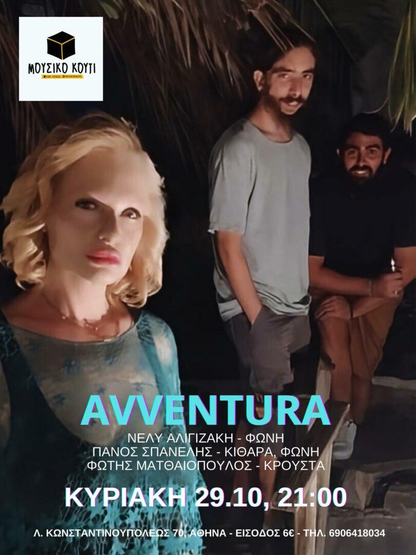 Η Nelly Aλιγιζάκη θα εμφανιστεί την Κυριακή το βράδυ στις 29 Οκτωβρίου στο γνωστό και φιλόξενο stage ‘’Μουσικό Κουτί’’ στο Γκάζι ,με το ακουστικό της σχήμα Avventura band. Μαζί με τους ταλαντούχους Πάνο Σπανέλη ( κιθάρα-φωνή) και Φώτη Ματθαιόπουλο ( κρουστά), θα παρουσιάσει την προσωπική της δουλειά που κυκλοφορεί από την εταιρία της ,FmRecords, αλλά και αγαπημένο ελληνικό και ξένο ρεπερτόριο από τη δεκαετία του ’70 μέχρι σήμερα ,σε ύφος έντεχνο ποπ και ροκ.