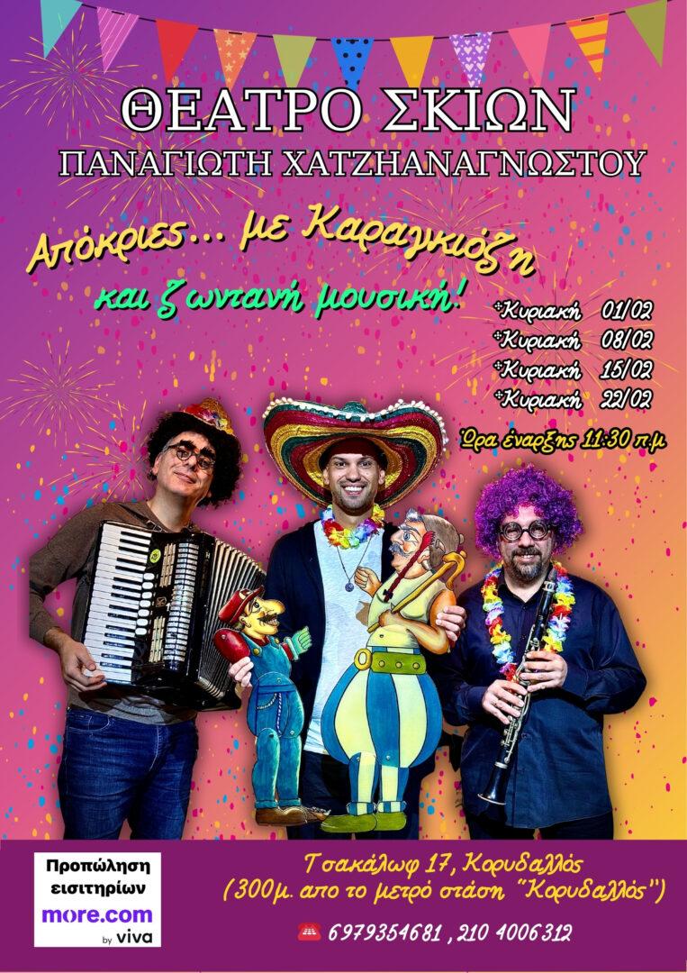 Το Θέατρο Σκιών Παναγιώτη Χατζηαναγνώστου υποδέχεται τις φετινές Απόκριες με χρώμα, γέλιο και αστείρευτο κέφι, προσκαλώντας μικρούς και μεγάλους σε μια ξεχωριστή αποκριάτικη εμπειρία γεμάτη παράδοση και ζωντάνια… Ο αγαπημένος ήρωας του λαϊκού μας θεάτρου, ο Καραγκιόζης, ντύνεται… καρναβαλιστής και ανεβαίνει στον μπερντέ σε αποκριάτικες παραστάσεις γεμάτες σάτιρα, χιούμορ και απρόοπτα, συνοδευόμενος από ζωντανή μουσική, που δίνει ξεχωριστό ρυθμό και εορταστική ατμόσφαιρα σε κάθε σκηνή.