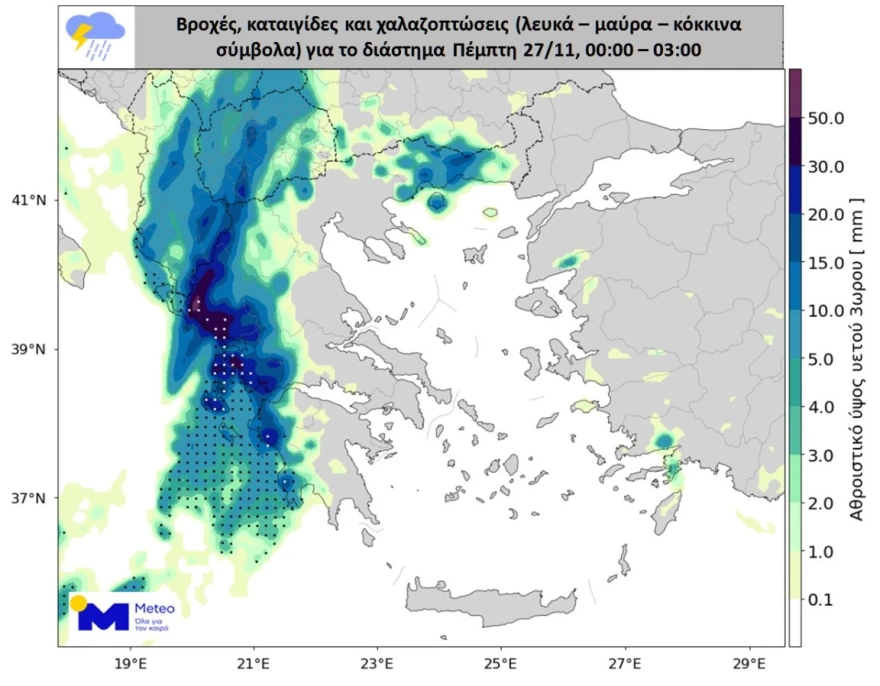 Σύμφωνα με τα προγνωστικά στοιχεία του meteo.gr / EAA, τις βραδινές ώρες της Τετάρτης ξημερώματα Πέμπτης ο καιρός θα παρουσιάσει περαιτέρω επιδείνωση. Τα φαινόμενα στα Επτάνησα, στα δυτικά ηπειρωτικά, στην Πελοπόννησο, στην Ανατολική Μακεδονία και στα Θράκη θα ενταθούν, ιδιαίτερα στα δυτικά όπου τοπικά θα έχουν πολύ έντονα χαρακτηριστικά και θα συνοδευτούν από χαλαζοπτώσεις. Κατά τη διάρκεια της νύχτας προς Πέμπτη (27/11) τα φαινόμενα θα επηρεάσουν αρκετές περιοχές της υπόλοιπης χώρας.