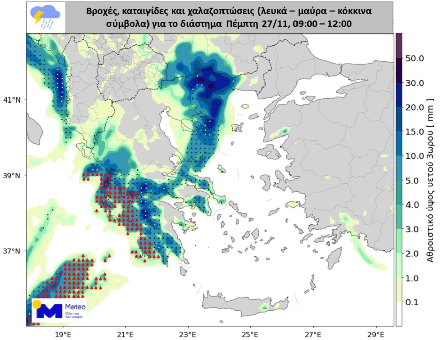 Την Παρασκευή (28-11-25) ισχυρές βροχές και καταιγίδες προβλέπονται σε κεντρική και ανατολική Μακεδονία, Θράκη, ανατολικό Αιγαίο και μέχρι νωρίς το πρωί στη δυτική Ελλάδα.