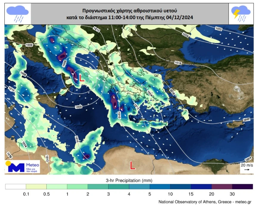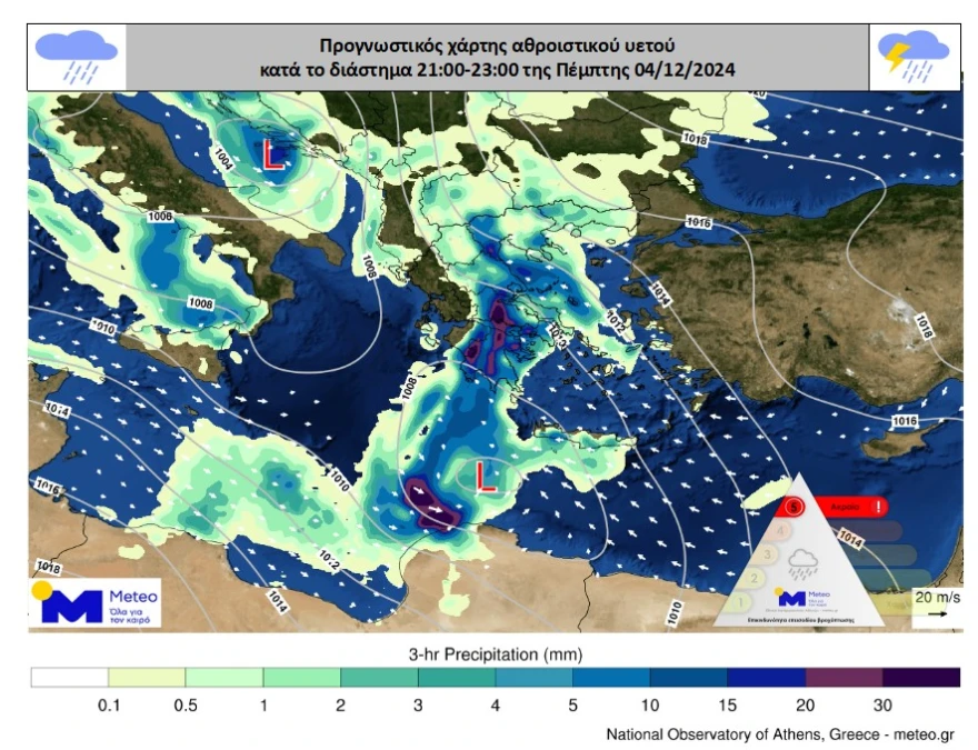 Σύμφωνα με τα προγνωστικά στοιχεία του meteo.gr / ΕΑΑ, ο καιρός θα παρουσιάσει επιδείνωση από αύριο Πέμπτη (4/12) από τα νοτιοδυτικά. Κύρια χαρακτηριστικά της μεταβολής θα είναι οι τοπικά ισχυρές βροχές και καταιγίδες με κατά τόπους μεγάλα ύψη βροχής τα οποία είναι ικανά να προκαλέσουν προβλήματα και οι ισχυροί άνεμοι στα πελάγη.