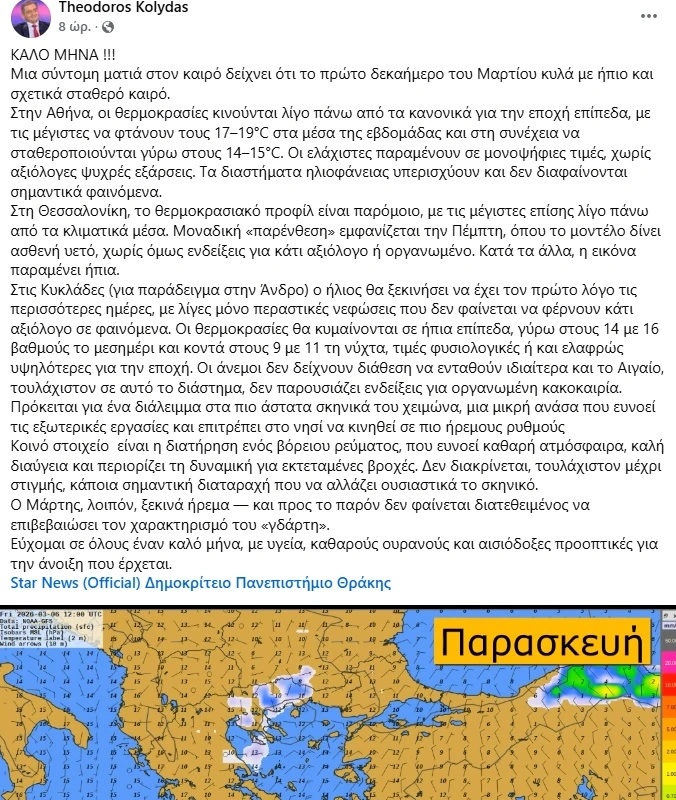 Η ανάλυση του μετεωρολόγου Θοδωρή Κολυδά δείχνει ότι ο καιρός τον Μάρτιο ξεκινά με ένα πολύ ήπιο και σταθερό πρόσωπο, διαψεύδοντας προς το παρόν τη φήμη του ως «γδάρτη». Το κύριο χαρακτηριστικό του πρώτου δεκαημέρου είναι οι καλές καιρικές συνθήκες με αυξημένη ηλιοφάνεια και θερμοκρασίες που κινούνται ελαφρώς πάνω από τα κανονικά για την εποχή επίπεδα.