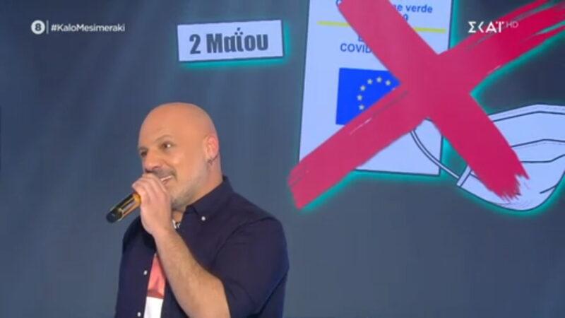 Ο παρουσιαστής θέλησε να σχολιάσει το γεγονός ότι τα πιστοποιητικά εμβολιασμού έχουν μεγαλύτερη διάρκεια από το πιστοποιητικό νόσησης ενώ εξέφρασε τραγουδώντας: