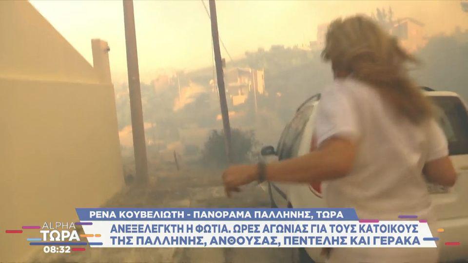 Η Ρένα Κουβελιώτη φαίνεται να τρέχει και να μπαίνει στο βανάκι του τηλεοπτικού σταθμού για να απομακρυνθούν. Λίγα δευτερόλεπτα νωρίτερα περπατούσε στους φλεγόμενους δρόμους και εξηγούσε. Ξαφνικά η φορά των ανέμων άλλαξε και η φωτιά κατευθύνθηκε προς το μέρος της.