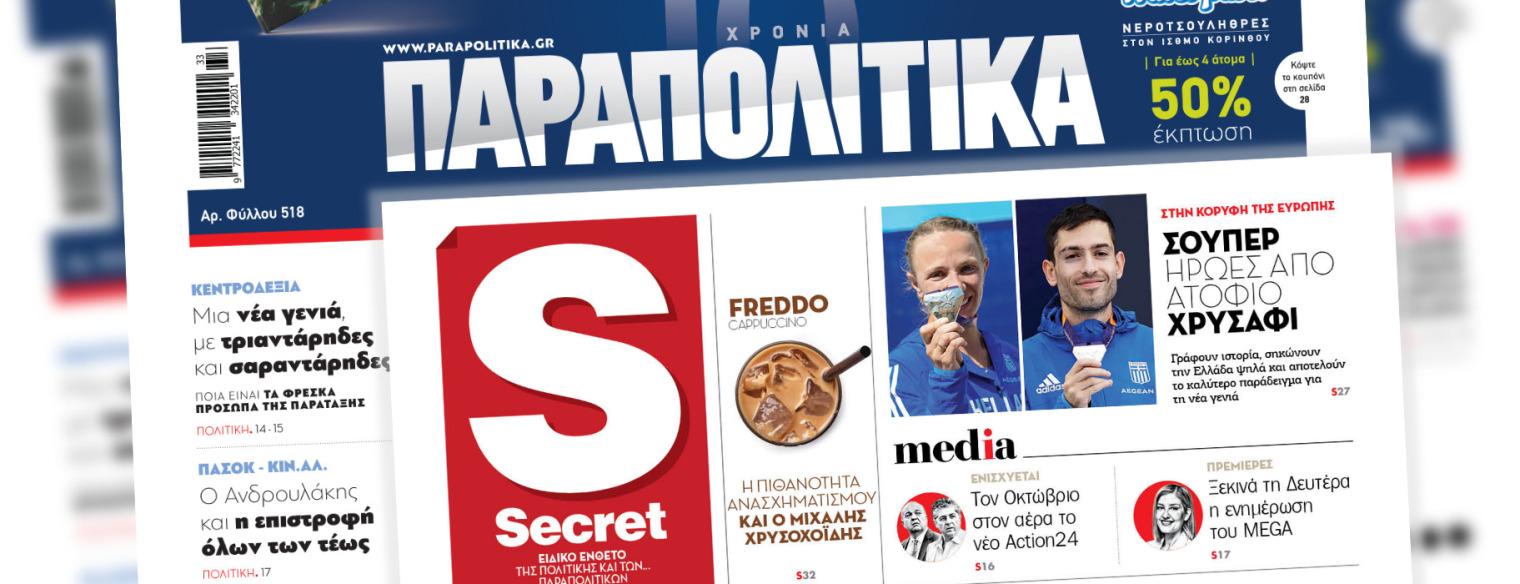 Αυτό το Σάββατο 20 Αυγούστου, η εφημερίδα ΠΑΡΑΠΟΛΙΤΙΚΑ κυκλοφορεί σε όλα τα περίπτερα της χώρας με πλούσια θεματολογία και πολλές αποκλειστικότητες. Αποκαλυπτικά θέματα, ρεπορτάζ και μεγάλες προσφορές για όλους τους αναγνώστες μας!