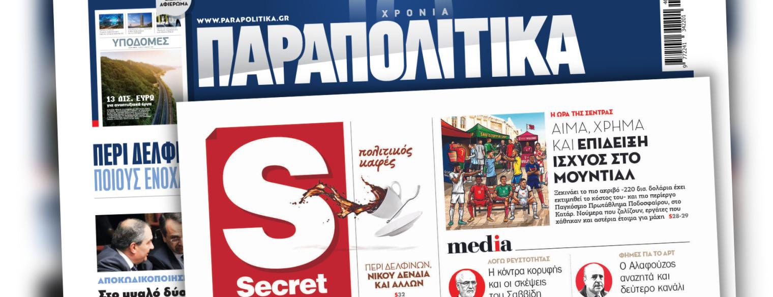 Αύριο Σάββατο 19 Νοεμβρίου η εφημερίδα «ΠΑΡΑΠΟΛΙΤΙΚΑ» κυκλοφορεί σε όλα τα περίπτερα της χώρας με πλούσια θεματολογία και πολλές αποκλειστικότητες. Αποκαλυπτικά θέματα, ρεπορτάζ και μεγάλες προσφορές για όλους τους αναγνώστες μας!