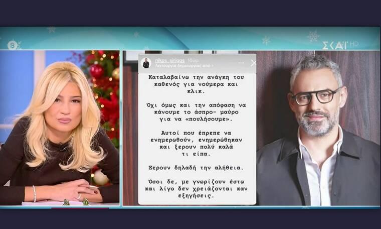 Στη συνέχεια, ο Νίκος Συρίγος έκανε μία ανάρτηση, στην οποία αποδίδει το πώς διατυπώθηκε η φράση στο μοντάζ και στα site. Κάπως έτσι το θέμα έφτασε στο Πρωινό και απάντησε η Φαίη Σκορδά.
