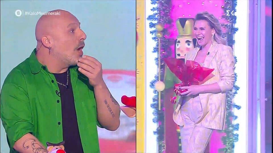 Έτσι, λίγο μετά τις 4 το απόγευμα, η πόρτα στο πλατό του Νίκου Μουτσινά άνοιξε και εμφανίστηκε η Κατερίνα Καραβάτου. «Θα τα πούμε άλλη φορά αναλυτικά γιατί σήμερα ήρθα εδώ μόνο και μόνο για να σου κάνω ποδαρικό στην πρώτη εκπομπή. Ξέρω τι άνθρωπος είσαι, σ’ αγαπάω πάρα πάρα πολύ και είμαι εδώ για αυτό» τόνισε η Κατερίνα Καραβάτου.