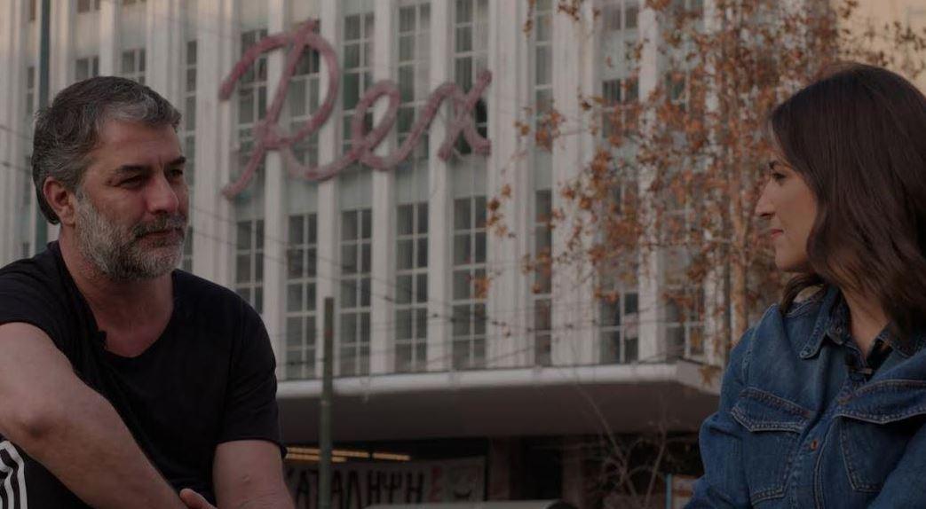Συναντά τον Βασίλη Μπισμπίκη έξω από την κατάληψη του θεάτρου REX, συνομιλεί με τον Γιάννη Μπέζο και ακούει τον Αργύρη Ξάφη, λίγες ώρες μετά την επιστροφή του στην Ελλάδα, να εξηγεί τη συμβολική κίνησή του στην Μπερλινάλε να αναρτήσει πανό διαμαρτυρίας.