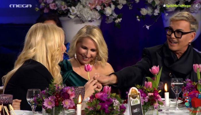 Και οι δύο ήταν προσκεκλημένοι της Ρούλας Κορομηλά στο αναστάσιμο «Σπίτι με το Mega» όταν ο Λάκης έβγαλε μια τουλίπα από τη διακοσμητική σύνθεση που είχε μπροστά του για να την προσφέρει στη δημοσιογράφο δίνοντας της ευχές.