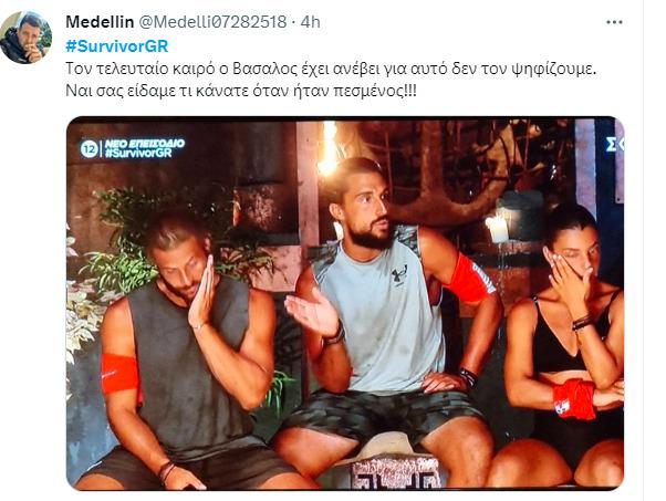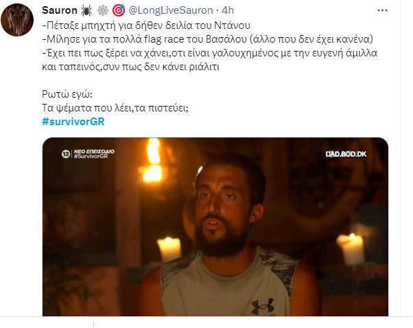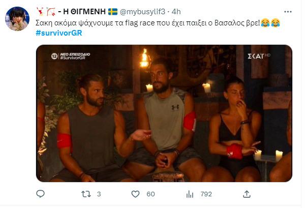 Προς υπεράσπιση του Κωνσταντίνου Βασάλου πήρε το λόγο ο Σάκης Κατσούλης, ο οποίος ανέφερε πως ο συμπαίκτης του έχει βελτιωθεί αρκετά και έχει παίξει και σε αρκετά flag race με το Twitter να απορεί πότε έγιναν αυτά τα flag race αφού ο συγκεκριμένος παίκτης θεωρείται από τους πιο αδύναμους παικτικά στο φετινό Survivor.