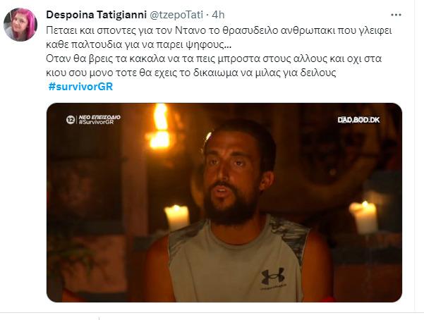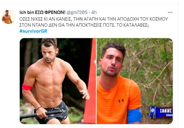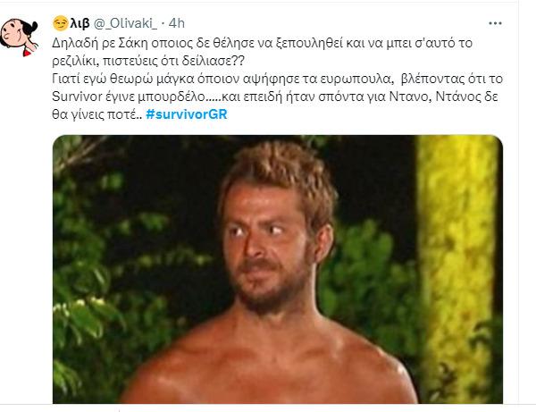 Αυτό «ξεχείλισε» το ποτήρι για τους χρήστες του Twitter, οι οποίοι θεώρησαν πως ο Σάκης Κατσούλης αναφέρεται στον Ντάνο, αφού αυτός ήταν ο μοναδικός καλός παίκτης και νικητής του Survivor που δεν μπήκε φέτος στο ριάλιτι. Έτσι, για άλλη μια φορά ο Σάκης Κατσούλης μονοπώλησε τα σχόλια στο Twitter, ωστόσο για όλους τους λάθος λόγους.