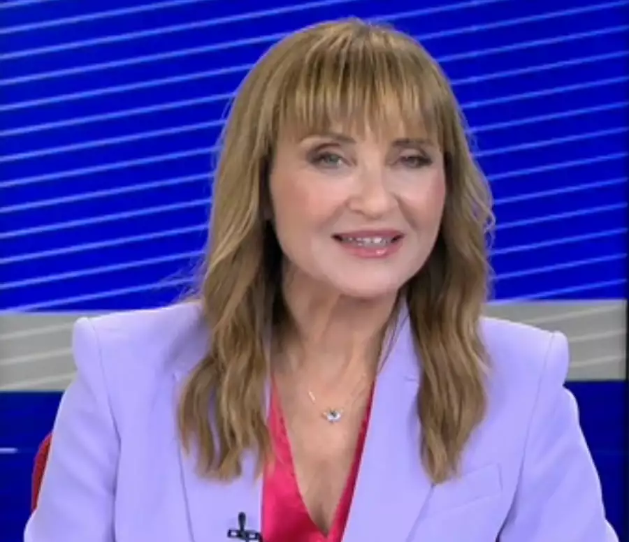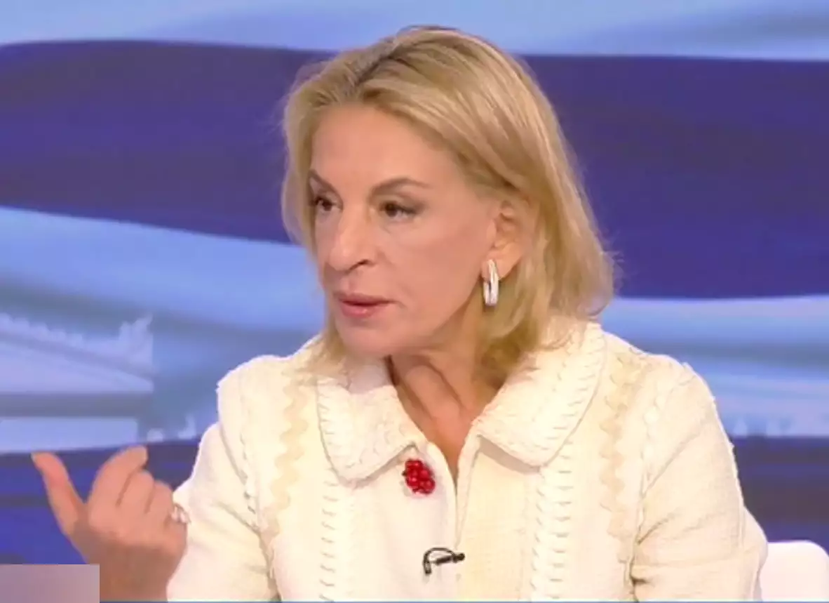 Ανοιχτό μπεζ σακάκι με κόκκινη καρφίτσα επέλεξε η Όλγα Τρέμη στο OPEN.