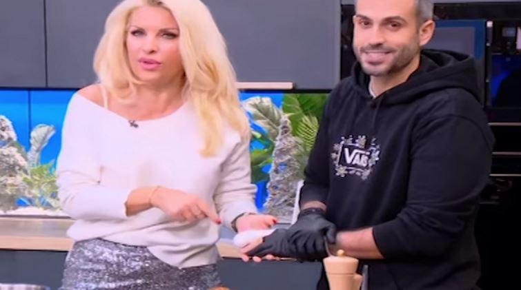 Η Ελένη Μενεγάκη, ζήτησε στον Γιώργο Τσούλη να μην κρύβει το χέρι του και μάλιστα έδειξε στην κάμερα το μανταρισμένο δάχτυλο του σεφ, ο οποίος είχε ατύχημα νωρίτερα το πρωί, όσο έκανε την προετοιμασία για το φαγητό που θα παρουσίασε στους τηλεθεατές.